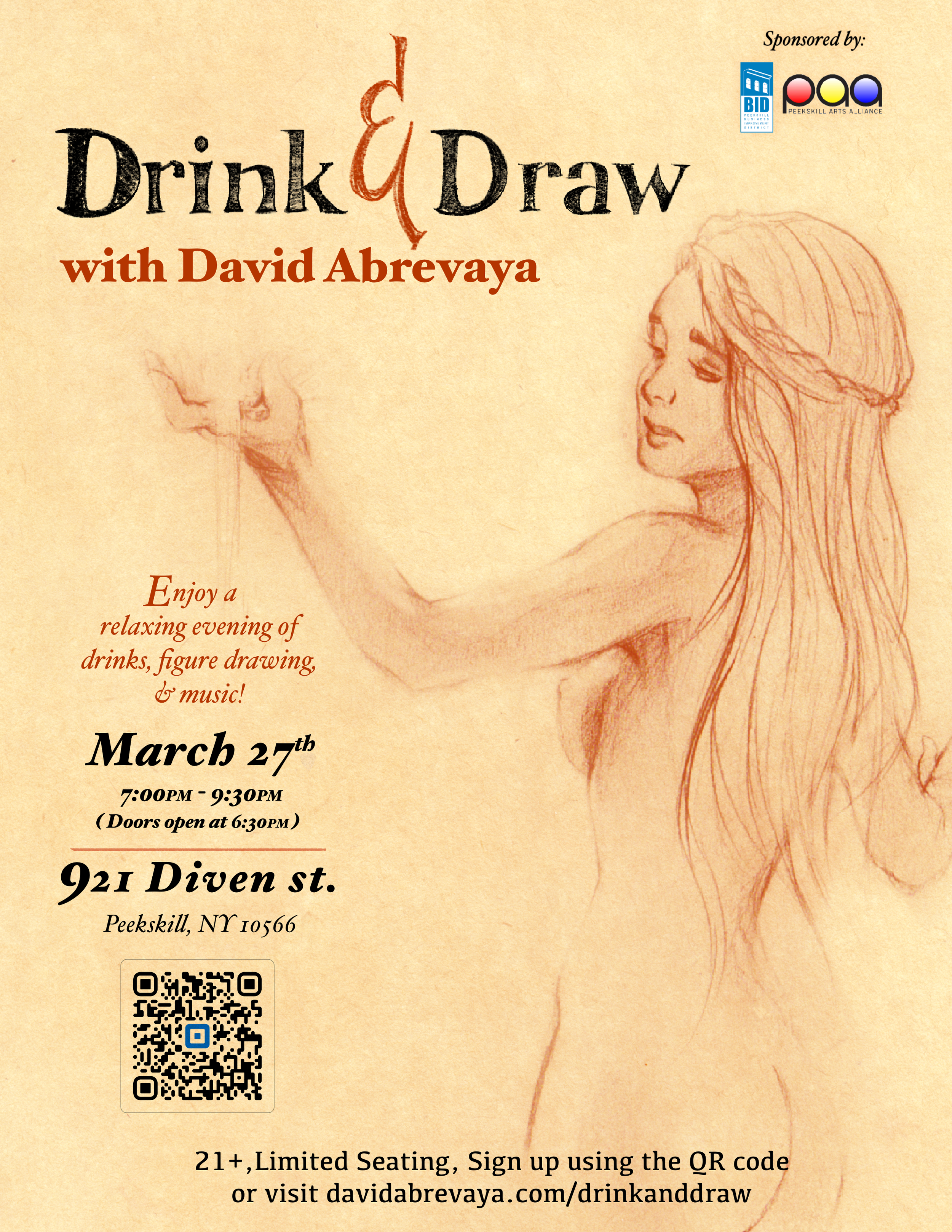 A Drink and Draw event located in Peekskill, NY that blends classical study with a fun twist. This monthly session unites the artist community through drawing, drinks, and music, welcoming all skill levels, whether you’re a pro or can barely draw a stick figure!